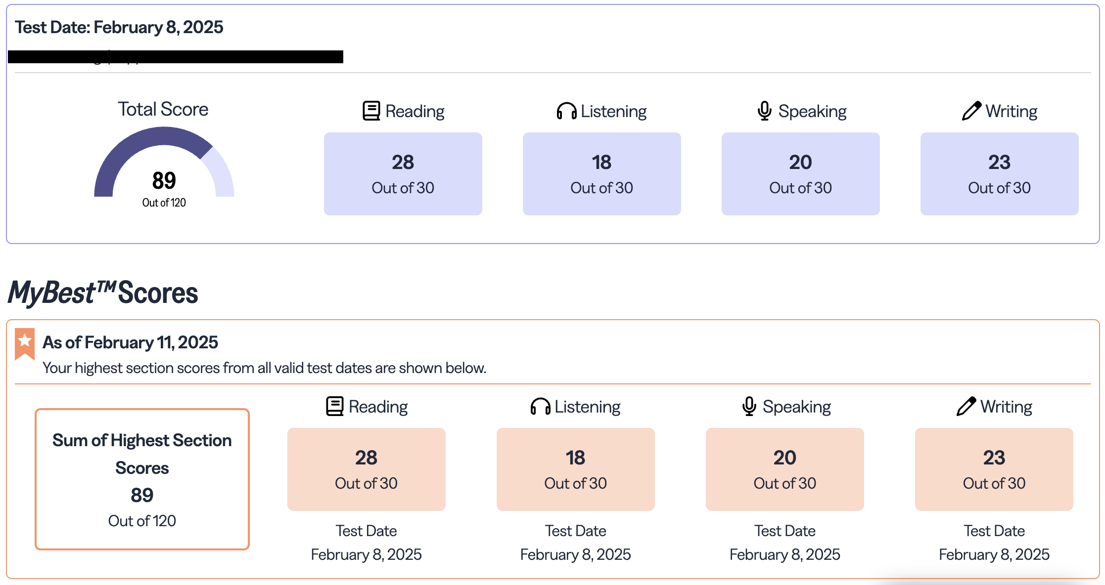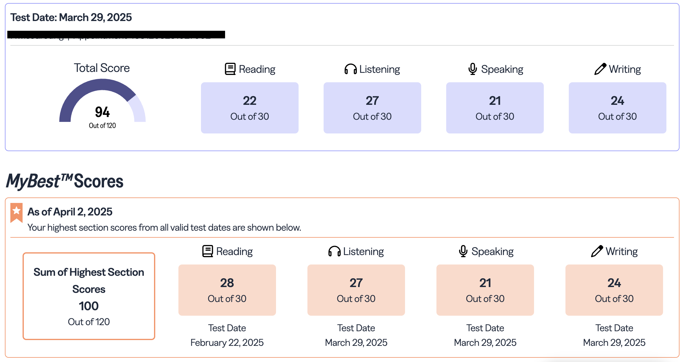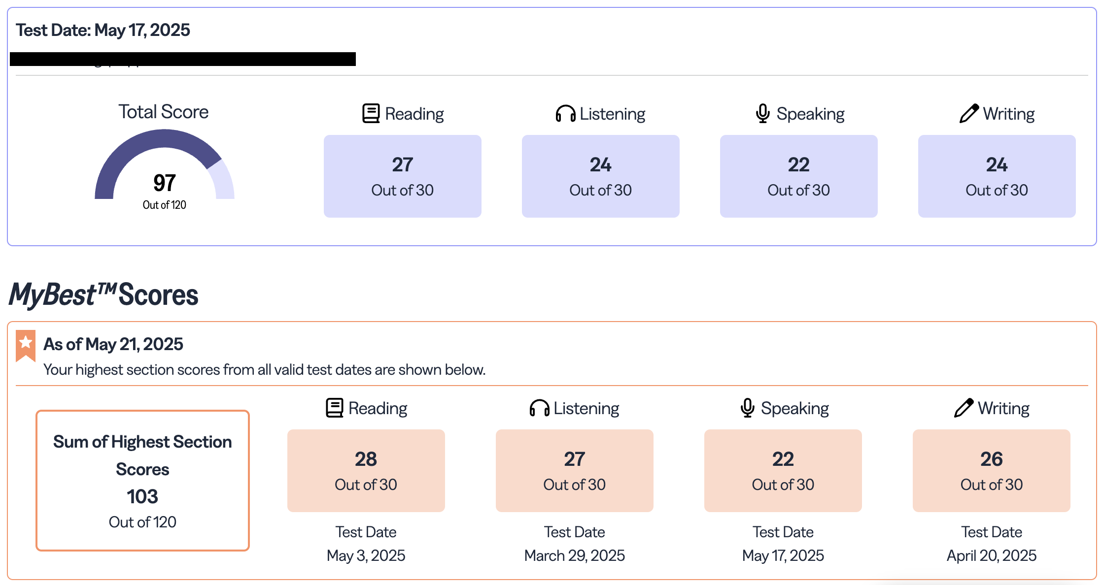 제일 최근에 친 시험이 5월이었고, 저는 97점이라는 다소 아쉬운 점수로 토플을 잠시 중단했습니다.