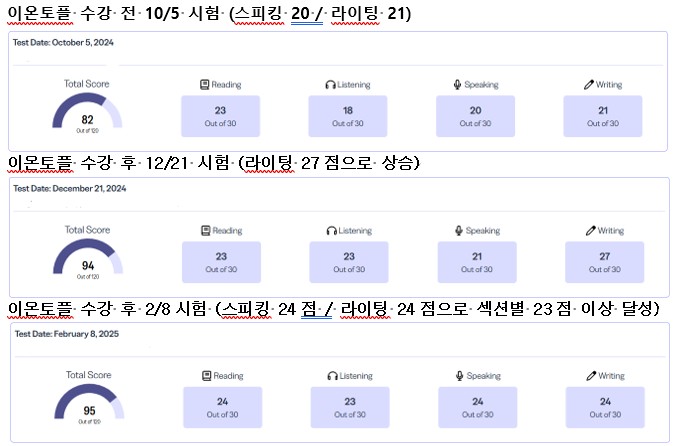 이온토플을 12월에 신청하여 1개월 간 단기처방으로 공부하였는데, 가까스로 그렇게 1년 가까운 시간 동안 점수변동이 없었던 스피킹과 라이팅에서 24점, 27점을 받게 되었습니다.