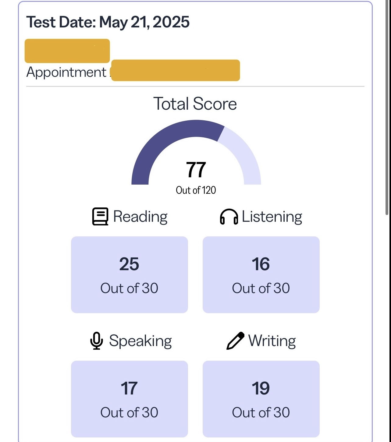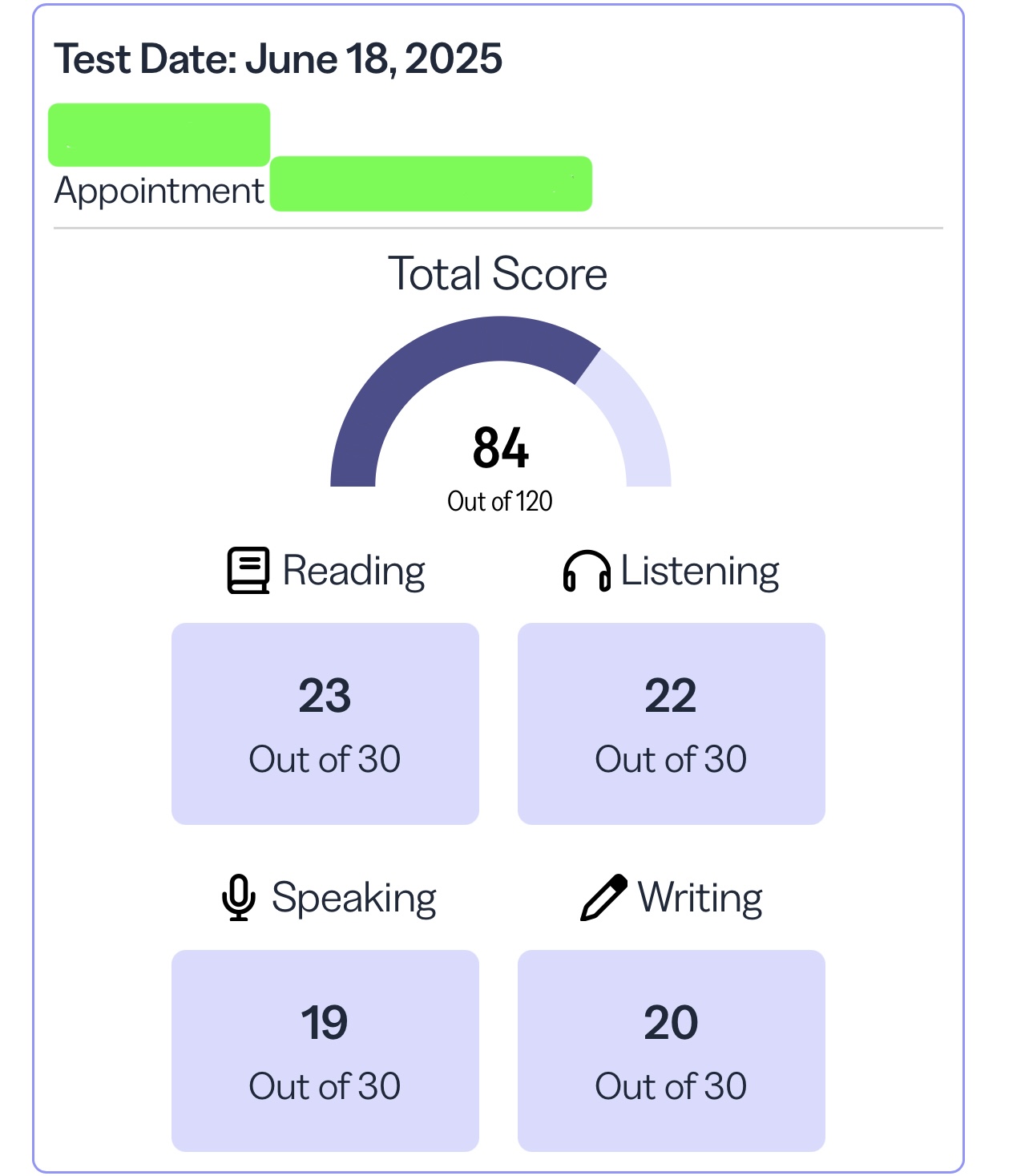 하지만 토플과외는 저에게 맞지 않았고, 대형학원들도 꺼려졌습니다… 그래서 내벨업 챌린지를 신청했어요. 그 결과 저는 내벨업 챌린지 한달 차에 77점을 받았고 정확히 4주 후에 84점까지 올릴 수 있었습니다.