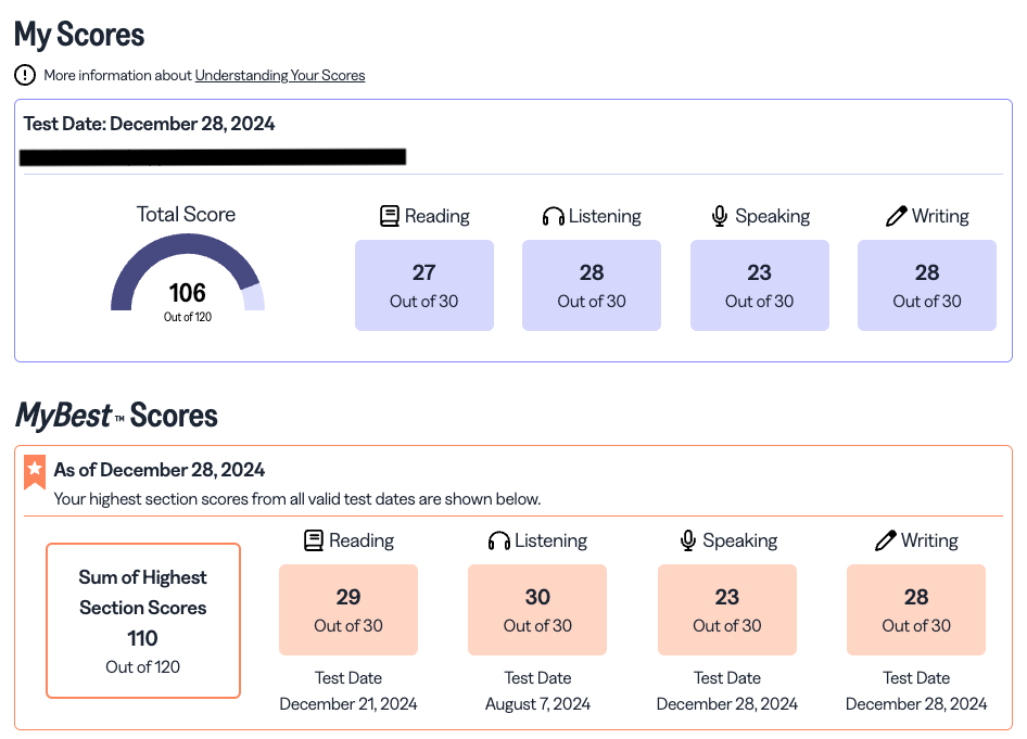 시험 첫 시험은 내벨업 시작 후 2주 후에 보게 되었는데, 첫 시험에 101점이 나왔습니다. 압축적으로 실전과 비슷하게 시험 유형을 익혔던 것이 도움이 된 것 같습니다. 그리고 나서 챌린지 기간동안 99점, 102점을 맞고, 잠시 멈췄습니다 (당시8- 9월). 저는 이 토플 점수로 끝날 줄 알았는데, 제가 11월에 우연히 컨택하게 된 학교가 요구하는 점수가 103점이어서 12월 이후에 전혀 공부를 하지 못한 채로 시험을 보았더니 106점이 나왔습니다. 운도 잘 따랐다고 생각하지만, 사실 학위논문으로 인해 너무 바빠서 연습은 하지 못하고 입문서만 다시 읽었는데, 이게 도움이 된 것 같습니다. 결론적으로 가장 원하는 학교의 커트라인이 103점이었는데, 106점을 맞고 지원을 할 수 있게 되었습니다^^ 이제 좋은 합격 결과만 있으면 좋겠네요.