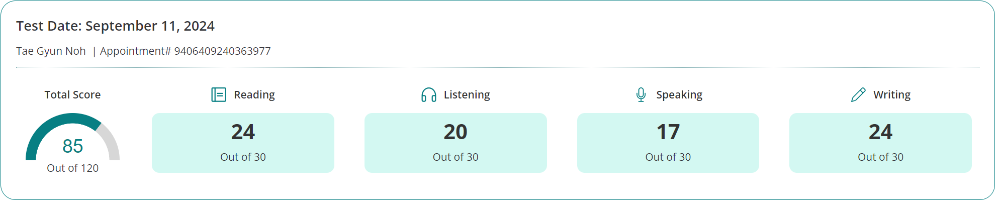 사실 그런 생각은 있어요. 아… 시험 한 두 번만 치면 성적 쭉쭉 오르겠는데… 제가 홈에디션만 쳐서 노트북 마이크 음질이 안 좋아 그런지 항상 스피킹 성적은 밑바닥인데 (저는 잘 한 것 같은데요 ^^..) 그래도 한 번 더 치면 90점 이상은 바로 나올 것 같아요 ㅎ 그런데 그럴 필요가 없으니 여기서 그만하려고요. 돈 에너지 아껴서 이제는 조금 쉬는데 투자하려고요.