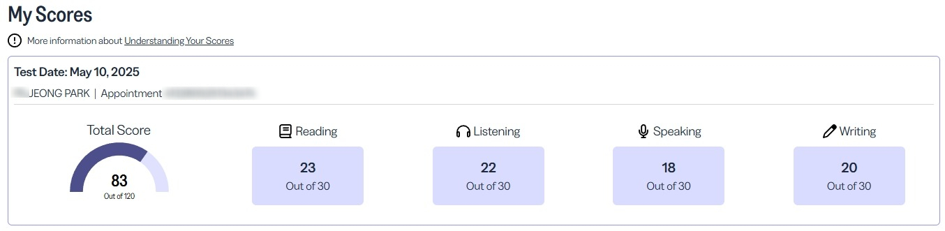 두번째 시험도 큰 긴장감 속에서 치렀지만 확실히 처음보다는 정신이 차려진 상태로 시험을 칠 수 있었고 리딩 지문을 보자마자 이온 토플에서 많이 문제를 풀었던 패턴의 문제들이 많이 등장하여 자신있게 정답을 고를 수 있었습니다. 리스닝도 첫 시험이후 실전과 같이 공부를 했을 때, 20~25점 사이의 점수를 계속 꾸준히 유지 했었는데 리스닝 문제를 풀던 중 다른 시험자분들께서 스피킹하는 소리에 당황을 하여 문제를 풀 수 없었습니다.