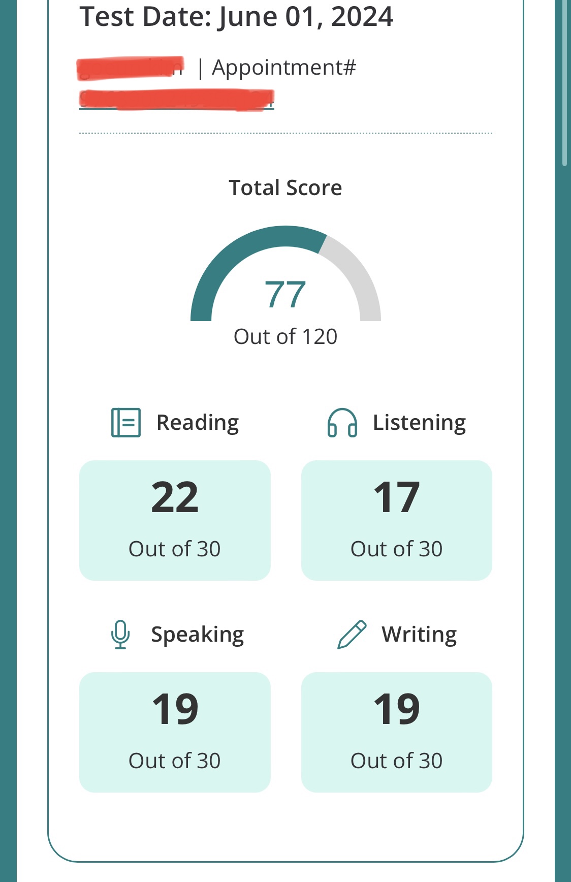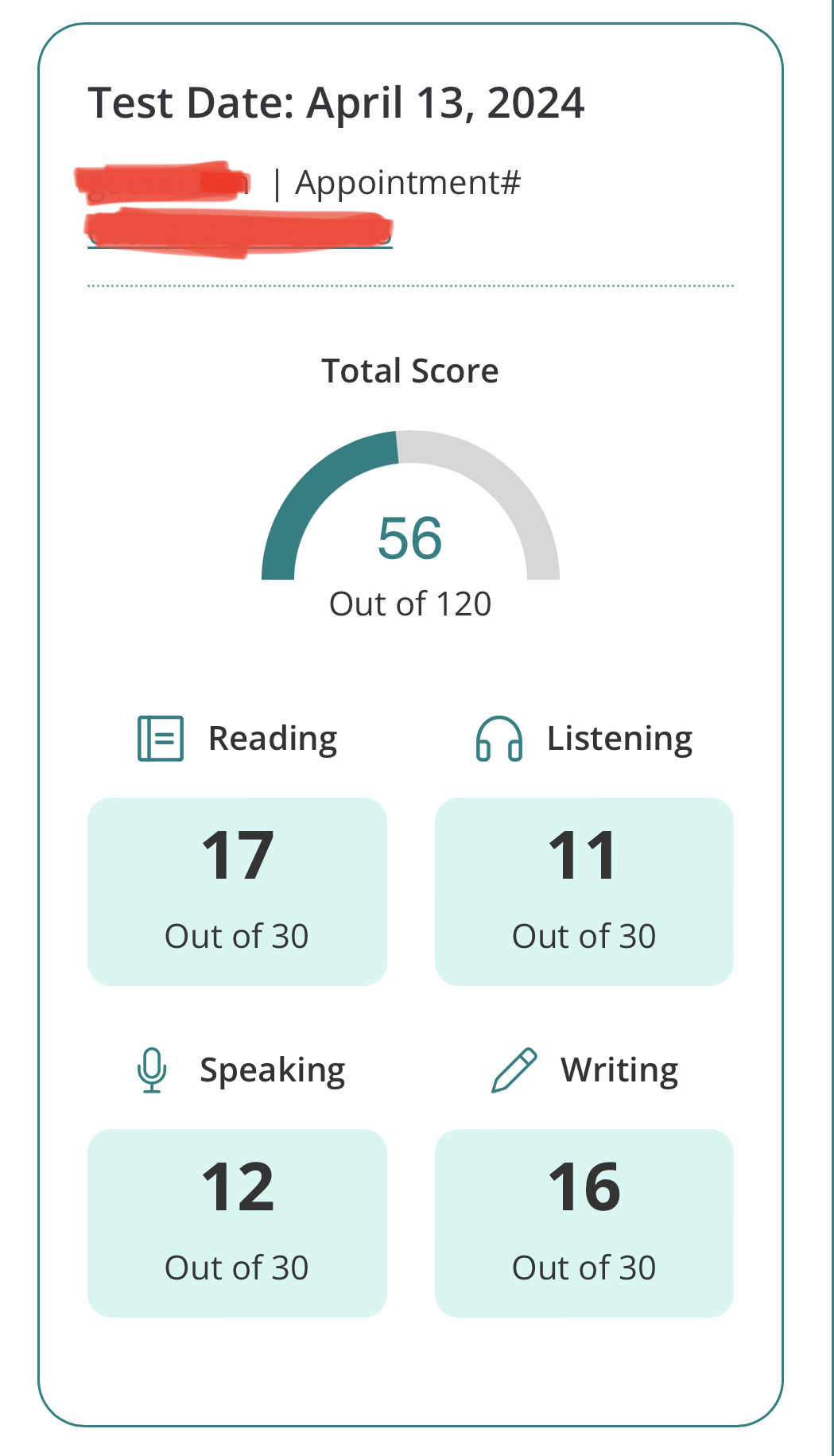 선생님이 한달만에 첫시험을 보라고하셔서 정말 두렵고 잘할까 걱정이 되었지만 시험을 쳐보라는 이유는 다 있더라고요. 한번 해보니까 진짜 제 실력이 어떤지 알게되었고 어떤 파트가 부족한지 알 수 있었어요. 전 부족한 리스닝파트를 채우며 다음 시험을 준비하려고 합니다. 리스닝능력은 스피킹 라이팅에도 필수이기 때문에 열심히 공부해서 빨리 다음 시험을 치고싶어요.