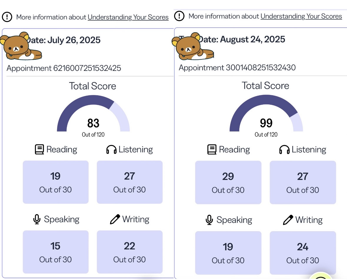 3. 내밸업챌린지 4주차가 완료된 시점에서 토플 첫 시험을 봤습니다. 스피킹과 라이팅은 몇 번 연습도 못해본 상황이었기에 점수에 크게 기대를 안 했지만, 83점이라는 꽤나 높은 점수가 나왔습니다. 그 후 스라첨삭 전까지 리딩점수 올리기에 집중하라는 조언을 받고 1달간은 리딩 오답을 더 열심히하며 2번째 시험을 내밸업챌린지를 모두 끝낸 시점에 봤습니다. 리딩은 10점이나 올랐고 스피킹과 라이팅도 각 4점, 2점씩 올라 총 16점이 상승했습니다! 스라첨삭을 받기도 전에 본 시험에서 목표 점수를 넘기게 되어 예상보다 빨리 토플을 졸업하게 되었습니다!