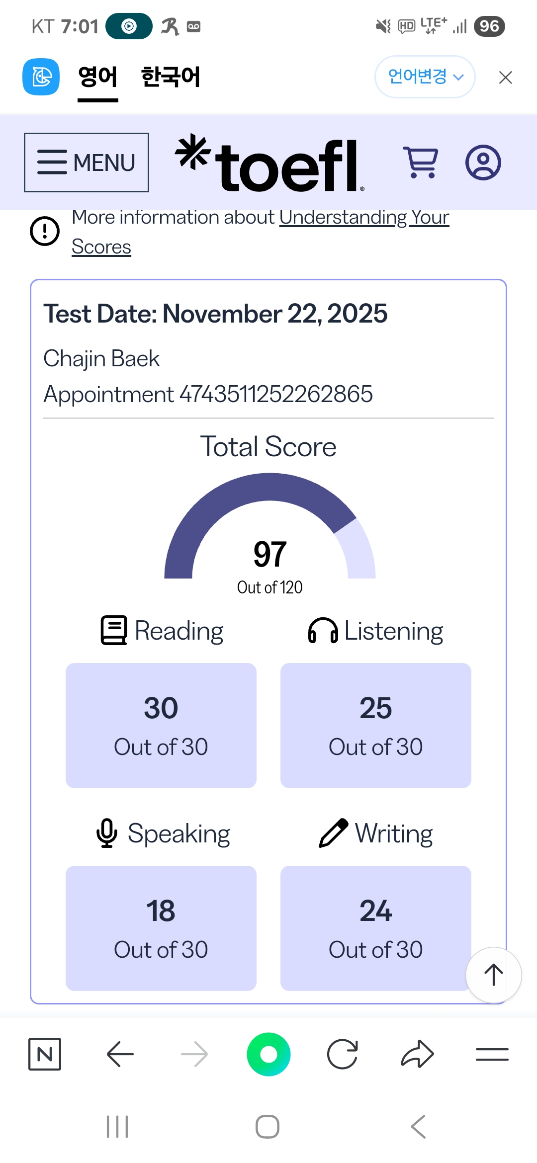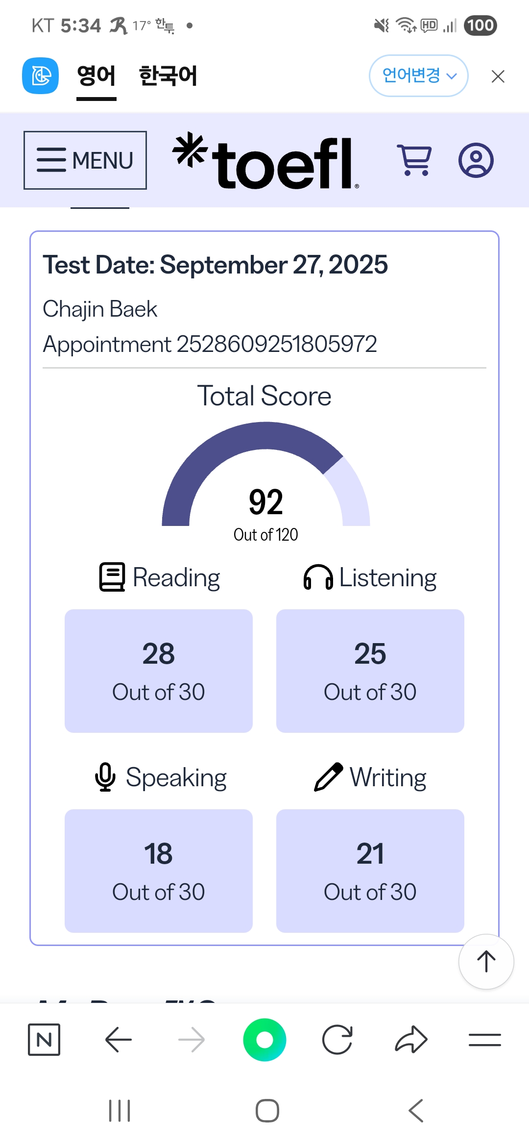 내밸업 챌린지를 통해 4주 후 첫시험을 쳤고 그 결과는 92점이었습니다. 하지만 라이팅 스피킹은 확실히 부족한 점수였고 스라 첨삭을 무조건 들어야겠다 생각이 들어 스라첨삭도 시작했어요.