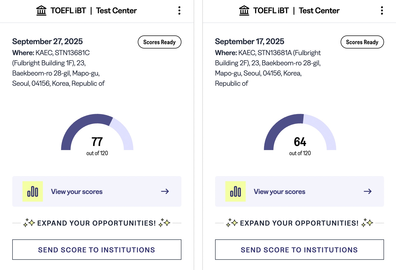 솔직히 처음에는 정보가 많이 없어서 망설였는데요, 대형 학원 체계보고 저거는 절대 못따라가겠다 충격먹어서 이온토플 바로 등록했습니다. 혼자서도 해보고, 학원도 문의해보고 했는데 토플은 확실히 책이 아닌 컴퓨터로 하는 실전 연습이 중요하더라구요. 이온토플은 컴퓨터로 실전처럼 토플을 꾸준히 연습시켜주는 체계여서 열심히 할 수 있었습니다! 독학도 그렇고 학원도 그렇고 무리한 스케줄에 책으로 공부하는 방법은 전부 시간 낭비 돈 낭비더라고요.... 진작에 이온토플을 알았다면 꽤 많은 돈을 아꼈을 것 같아요ㅠㅠ 영어를 좋아하고 회화도 문제없이 했었는데 토플은 아예 다른 세계여서 공부하는 내내 참 많이 울고 포기도 하고 싶었어요. 그치만 공부 보증금도 걸고 매일 인증하는 게 습관이 되면서 챌린지를 잘 완주할 수 있었던 것 같습니다. 필요했던 점수는 72점이었는데 77점 맞아서 웃으면서 토플을 보냅니다. 공부하는 동안 토플 많이 증오했는데 한 달 만에 끝낼 수 있게 해주신 이온토플 선생님께 참 감사드려요. 점수 나오는 날 그렇게 후련할 수가 없더라구요. 이온토플 공부 자료들은 진짜 버릴 게 없어요. 딱 공부해야할 것들만 알차게 짜여져있습니다. 그래서 더 효율적으로 공부할 수 있었어요! 다른 데서 쓸데없이 돈 주고 시간 주고 받은 자료들은 그렇게 실전에서 많이 필요 없는 것 같아요. 사실 토플 개정된다 그래서 한번 더 보려다가 대학원 준비로 바빠져서 여기서 멈춥니다. 다음에 다시 토플을 하게 된다면 그때도 저는 이온토플로 공부할 거예요. 저처럼 시간이 많이 없고 알찬 자료들로 효율적으로 공부하고 싶으신 분들은 이온토플로 준비하시길 추천드려요 ㅎㅎ