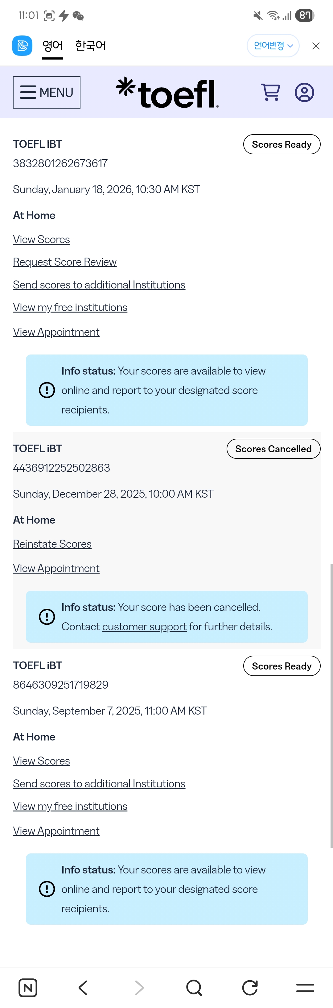 리딩 10 리스닝 14점이라는 충격적 점수에 멘탈이 나간 저는 그냥 점수취소를 눌렀습니다.