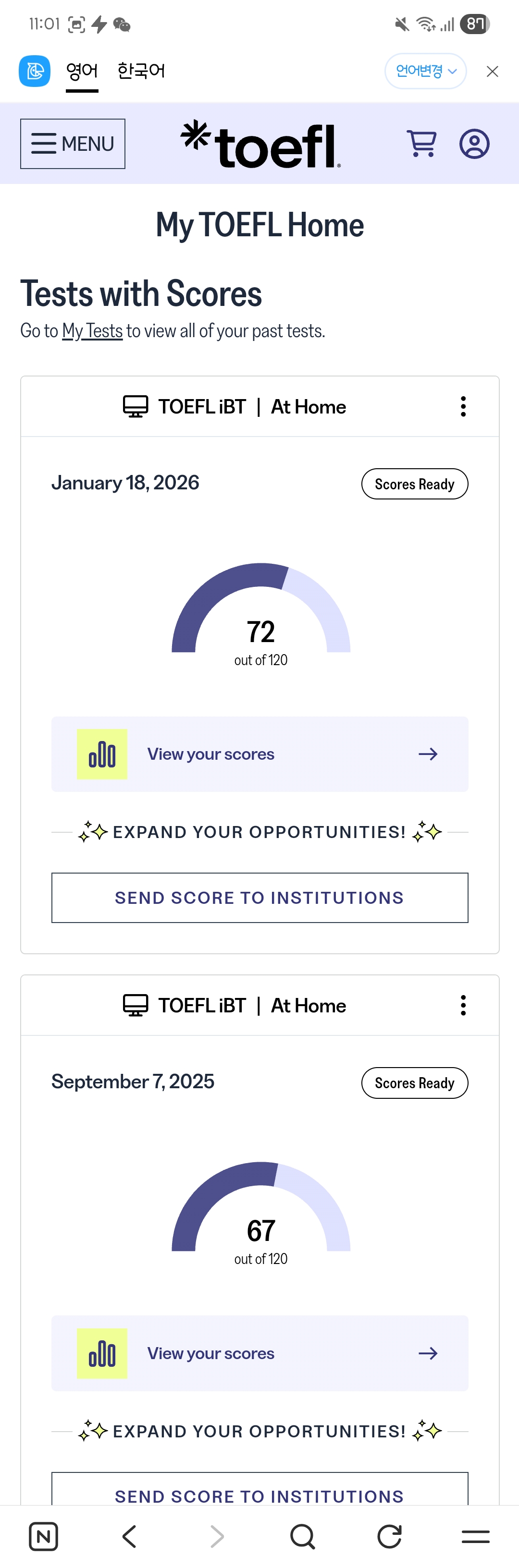 첫 시험 67보다도 5점이나 올랏고 특히나 리딩이 19점인게 전 너무 감동적이예요