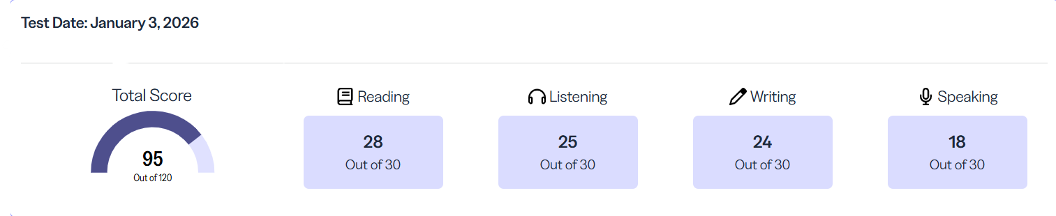 당시(2025년 11-12월) 저는 학교를 다니면서 토플 준비를 하고 있었는데요. 시험기간엔 정말 죽을 뻔 했어요.. 하지만 1/21부터 토플이 개정되기 때문에 정말 울면서 공부했습니다. 사실 토플 100점을 넘겨야 한다는 압박과 최대한 높은 학점을 받기 위해 노력하면서 멘탈이 많이 갈렸고, 시험장에서도 정말 많이 떨었어요. 하지만 제가 토플에 엄청난 노력을 했다는 것을 제가 잘 알기 때문에 5점 차로 100점을 못 넘겼을 때도 미련없이 털고 일어날 수 있었습니다. 원래 과정보다 결과가 중요하다고 생각하는 사람인데, 제가 이온토플을 통해 얼마나 많은 도움을 받았고 열심히 노력했는지 너무 잘 알아서 그 과정이 저한테는 너무 소중하게 느껴집니다.