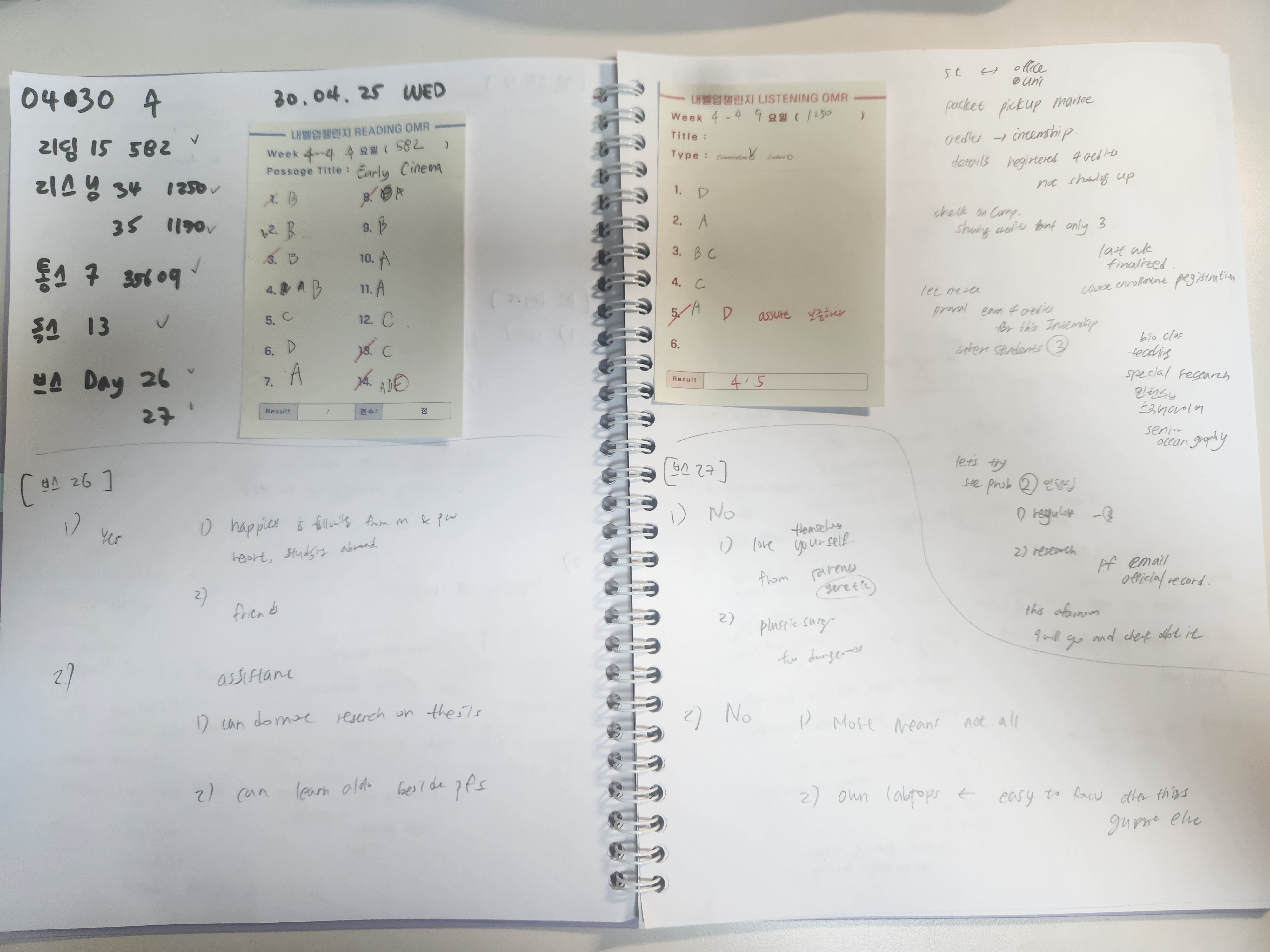 통스 오랜만에 해서 적응이 안되었다 그래도 열심히 했다 리스닝은 어제보다 망했고 리딩은 그럭저럭이었다 오답을 해보니 다 아는 걸 또 틀려서 화가 났다 브스와 독스는 쉬웠다. 오늘도 화이팅