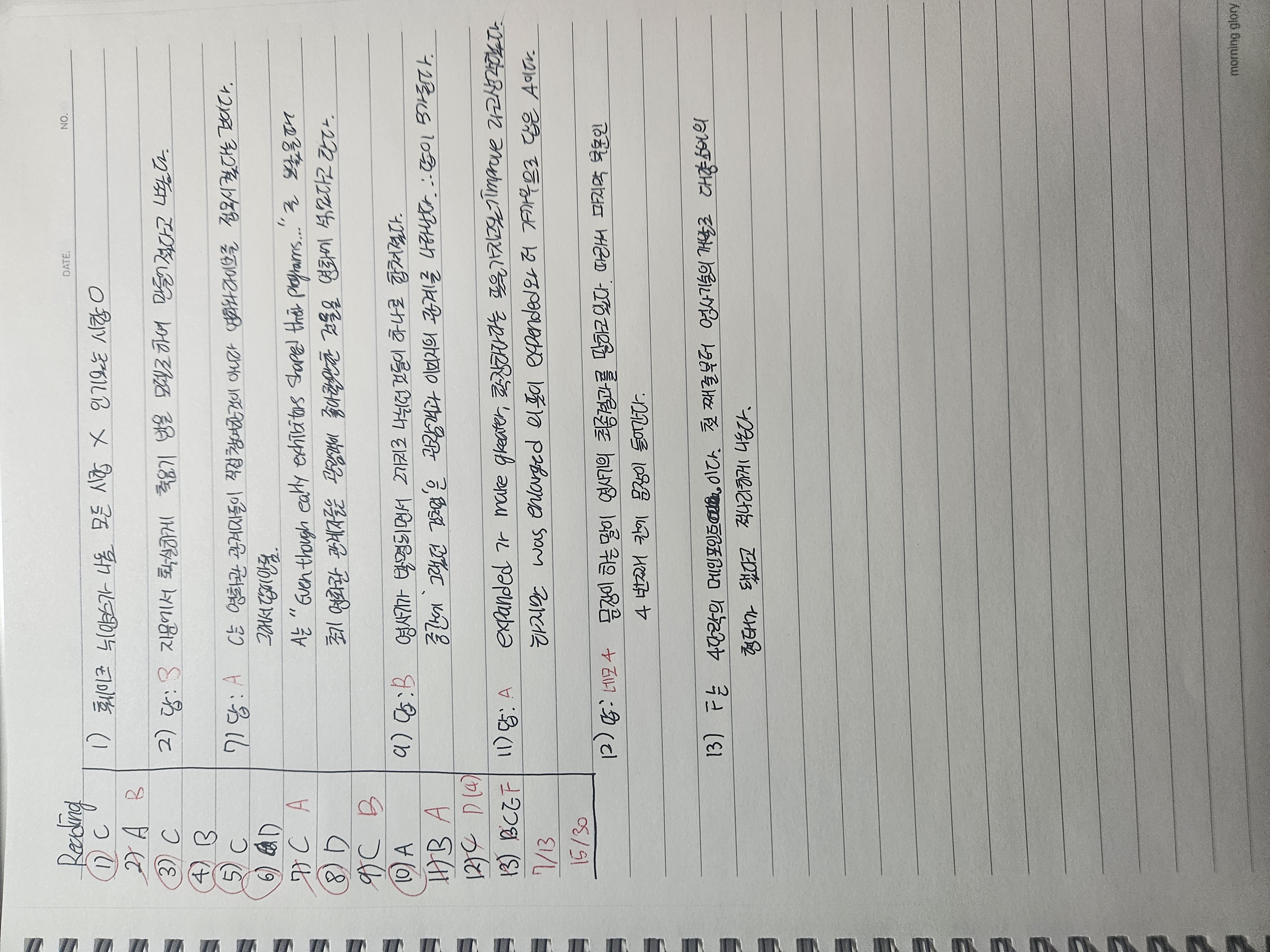 리딩 문제는 저번보단 좀더 높은 정확도를 보여주었다. 디테일 적인 부분에서 틀리는 실수는 계속 있었지만 저번보다 많이 줄었고 앞으로도 줄여나갈 것이다. 그리고 단어문제들을 평소에는 많이 틀리는데 오늘은 한 문제만 틀려 만족스러웠다.