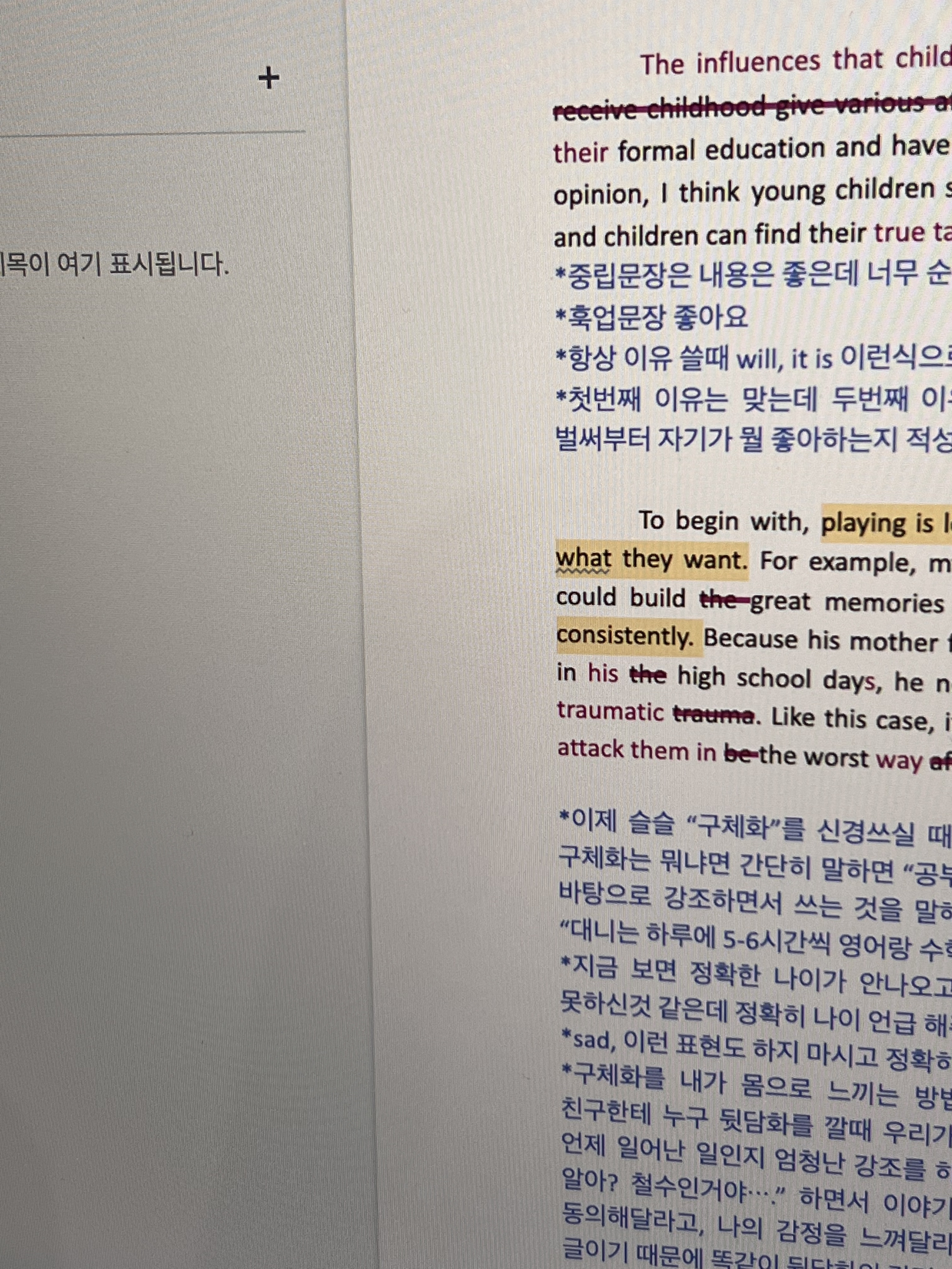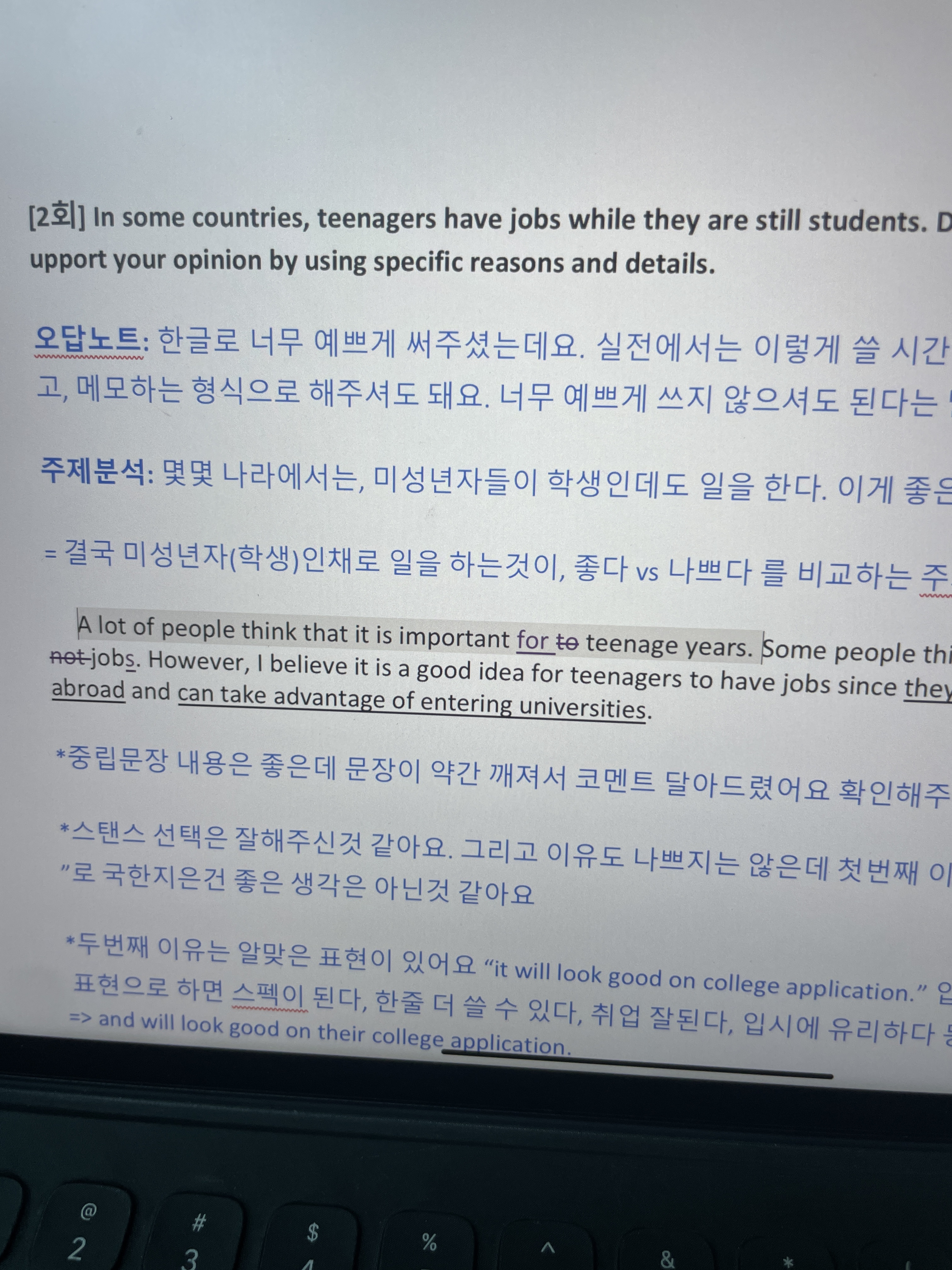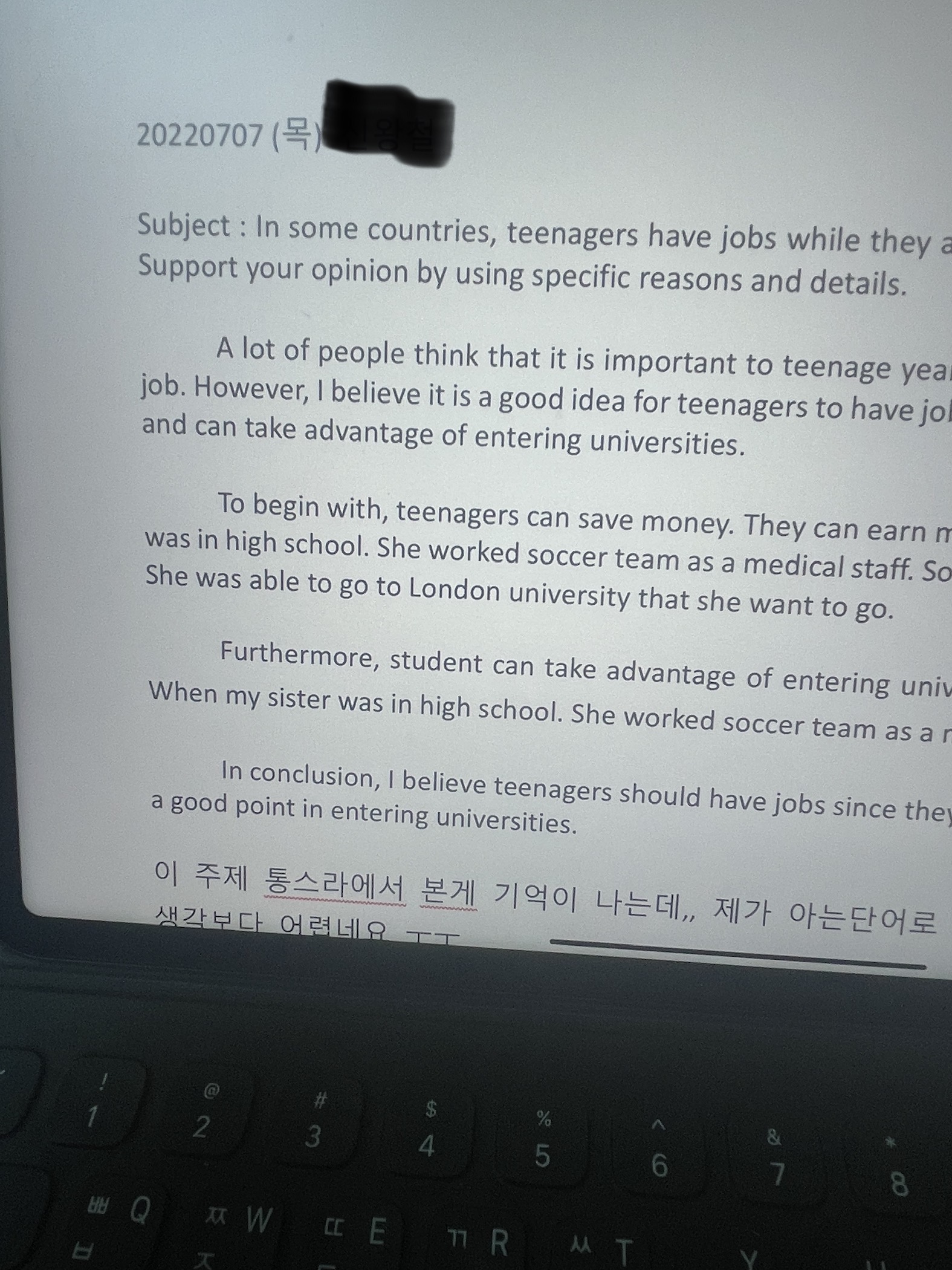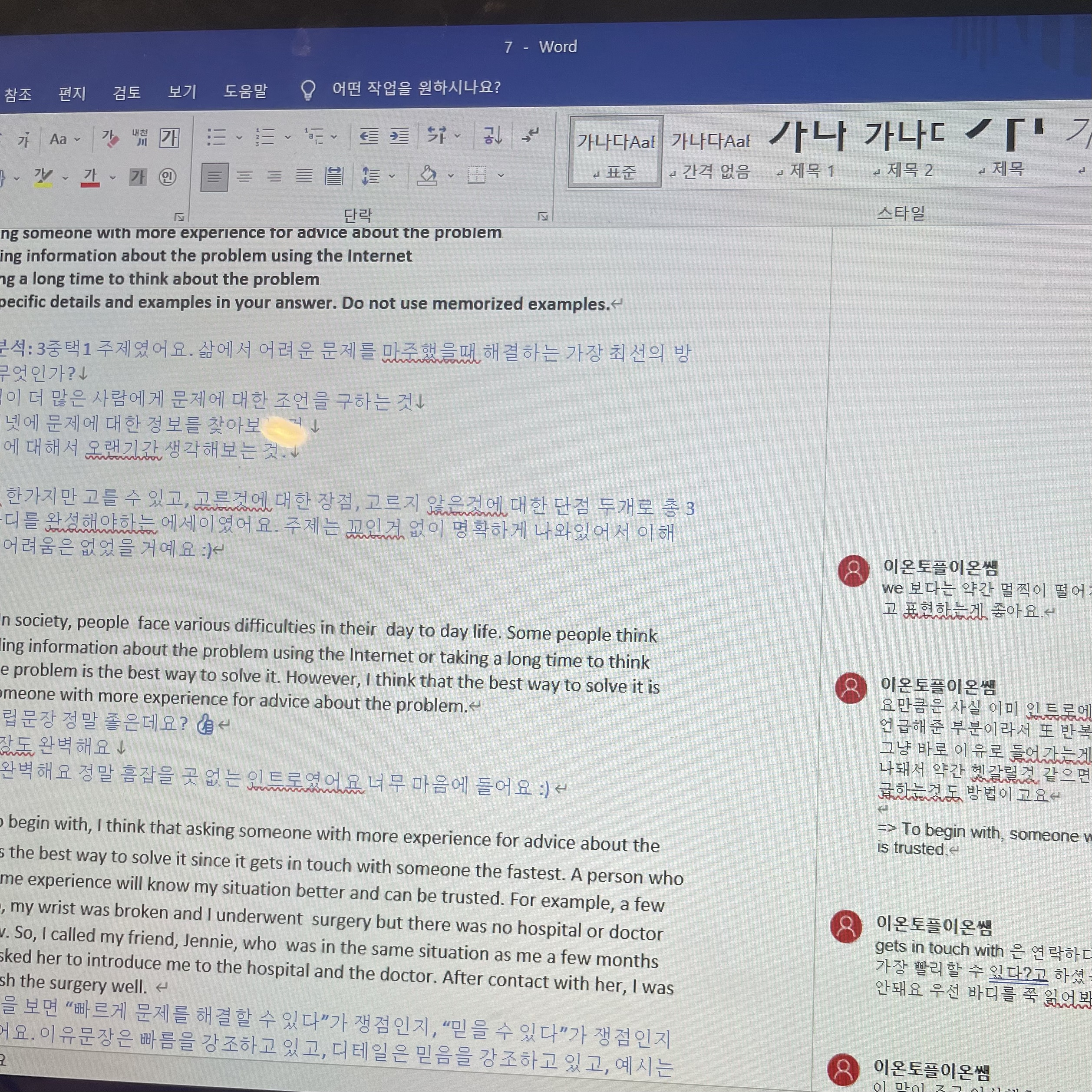 다른 친구가 저에게 독라 수업에 대해 물어볼 때, 매번 여력이 되면 꼭 들으라고 강력하게 추천하고 다닙니다. 우선 저는 후레학생이라 딱히 토플 공부를 열심히 하진 않고 계속 미루고 그랬었는데요.. 저처럼 누군가와 함께 하지 않으면 계속 미루고 집중도 안 하는 후레학생이신 분들에게도 추천합니다!! 저 같은 경우에는 비대면이라도 일단 누군가가 내 에세이를 검사를 한다는 거 자체에 강제력이 생겨서 꾸준히 공부할 수 있게 되더라고요. 학원도 좋은 수단이지만.. 사실 매일매일 몇 시간 동안 남이 계속 말하는 강의를 들을 자신도 없었습니다,,ㅎ 이 수업은 뭐가됐든 내가 직접, 꾸준히 계속 라이팅을 연습할 수 있다는 것이 장점입니다. 또 이렇게 제가 추천하고 다니는 가장 큰 이유는 수업을 받으면서 에세이를 쓰는 것이 즐겁구나,, 라고 처음으로 생각했기 때문이에요. 물론 이렇게 입소문을 낼 때 성적이 어마무시하게 올랐어요!! 라는 이유를 1순위로 이야기하는게 이온 쌤에게는 더 도움이 되겠지만,,ㅎ 저는 친구에게 라이팅이 재밌어졌어!! 라고 말하고 다닙니다. 저는 원래부터 잘한 것도 아니었구요, 제 원래 작문 실력은 정말 초딩(ㅋㅋ) 수준이었습니다. 첫 에세이는 28분동안 꼴랑 190단어 넘기는 것도 힘들었어요. 그런데 이온쌤과 같이 수업을 진행하면서, 쌤의 피드백을 보고 다시 글을 쓰고 하다보니 영어로 글쓰는 게 훨씬 편안해졌습니다. 글쓰기가 편안해지니 분량은 자연스럽게 늘더라고요. 특히 메일로 서로 코멘트를 주고받는게 너무 좋았어요. 처음에는 서면으로만 상호작용을 하는 게 너무 딱딱하지 않을까 걱정했는데 제가 잘 한 부분은 확실하게 칭찬해주시고!!(칭찬받을 땐 기분이 붕붕 날아갑니당) 제가 잘못한 부분은 놓치지 않도록 명확하게 전달해주셨습니다. 그냥 문법첨삭만 하는 게 아니라 내용 전개나 아이디어면에서도 조언해주셔서 전반적으로 제 글의 수준이 높아질 수 있었어요. 전 이온쌤의 코멘트가 너무 좋았는데요.. 일단 읽을 때마다 기분이 좋아집니다(ㅎㅎ빨간 줄 범벅인 날일 때 조차 좋았습니다). 이정도면 짝사랑 아니냐고 친구들이 놀릴 정도였어요,, 에세이를 쓸 때 예시로 제 친구들 이름을 막 갖다쓰면서 친구들을 온갖 풍파로 몰아넣는 것도 즐거웠고, 제가 되도않는 예시를 쓰면 이온쌤이 말이 되게 논리를 정리해주시는 것도 정말 좋았습니다. 처음에는 쌤이 마법을 부리는 것 처럼 신기했는데 이젠 저도 쥐콩만하게나마 따라할 수 있게 되었어요ㅎㅎ 예시도 정말 버라이어티한 이야기들을 많이 썼는데요, 연봉 2500만원(약 $25000)을 번다고 해야하는데 헷갈려서 연봉을 25만원(약 $250)으로 만들어버린 적도 있었고, 친구를 박봉으로 만든 게 미안해서 다음 에세이에는 친구를 하루아침에 백만 유튜버로 만들어 떵떵거리며 살게 해주고,, 아이디어가 마구 떠오르니까 정말 예시 쓰기가 즐겁더라고요. 제가 너무 사소한 거에 즐거워하는걸까요? 하지만 당신도 이온 쌤과 수업한다면 다른 이유로라도 즐거울 거라 확신합니다. 적어도 토플 라이팅 성적은 즐거울거에요ㅎㅎ 제가 백만장자였다면 다른 거 안 하고 계속 이온쌤에게 수업을 듣고 싶을 정도로 만족한 수업이었습니다. 뭐니뭐니해도 공부가 즐거운 게 1순위 아니겠어요? 특히 토플 공부가 괴롭고 힘들다면 더욱 추천합니다^_^ 저는 독라 수업이 너무 만족스러워서 통스라도 신청하려고 했다가.. 두 달 연속으로 선착순 실패했지만... (ㅠㅠ) 다른 분들도 손꾸락 연습하고 신청하세요,,ㅎ